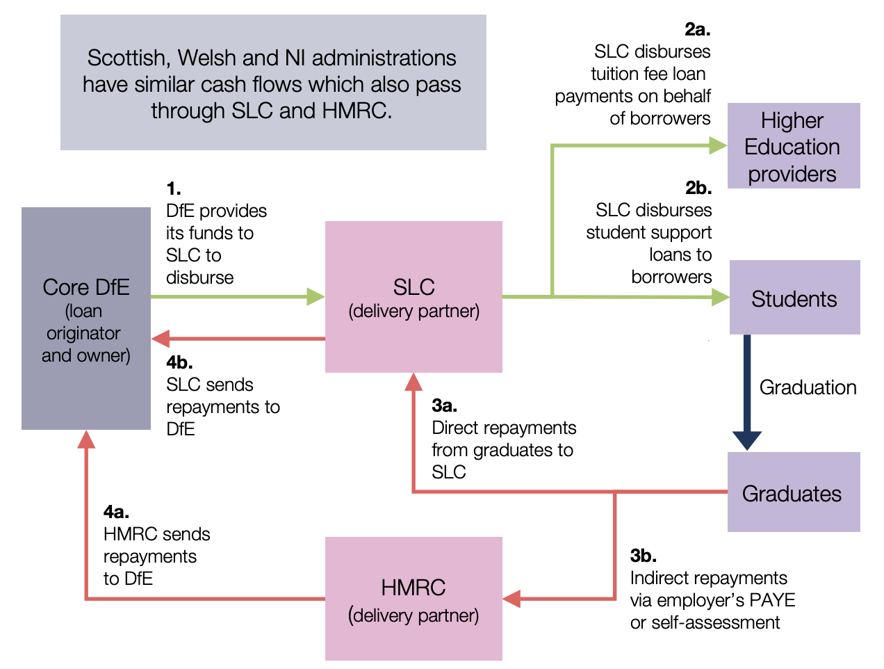 Student loans are issued by the Student Loans Company – which, despite the name, is a public body not administered on a profit-making basis – on behalf of the Department for Education (DfE). Payments are either made to the borrower or direct to the educational institution. Compulsory repayments are collected by His Majesty’s Revenue and Customs through the tax system; voluntary repayments and repayments abroad are made directly to the Student Loans Company. This complex process is shown below in the graph from the DfE annual report.3